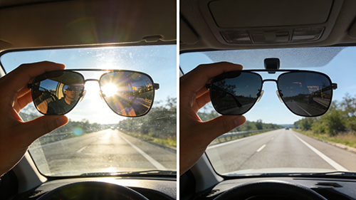 Tilt them over a phone/tablet/computer screen: Significant dimming or rainbow stripes signal polarization; steady brightness suggests non-polarized. Alternatively, view reflective surfaces (roads, water, car windows)—reduced glare confirms; persistence indicates standard lenses (non-polarized). (Note: UV protection testing follows below.)