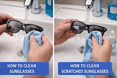 How to clean sunglasses? Rinse with lukewarm water, gently rub lenses/frames with fingers, then pat dry with a microfiber cloth. Shun tissues, ammonia, or fabrics—they scratch. How to clean scratched sunglasses? Scratches can't vanish, but rinse warmly, suds with neutral dish/soap, and microfiber-dry; lens sprays sharpen. Buff gently for minor haze.