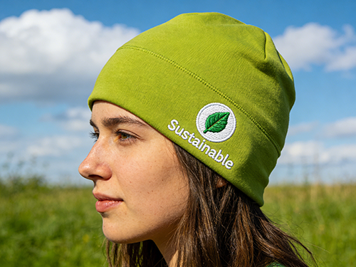 - Eco Beanie: Recycled yarns; sustainable for green eco-friendly branded winter beanies.